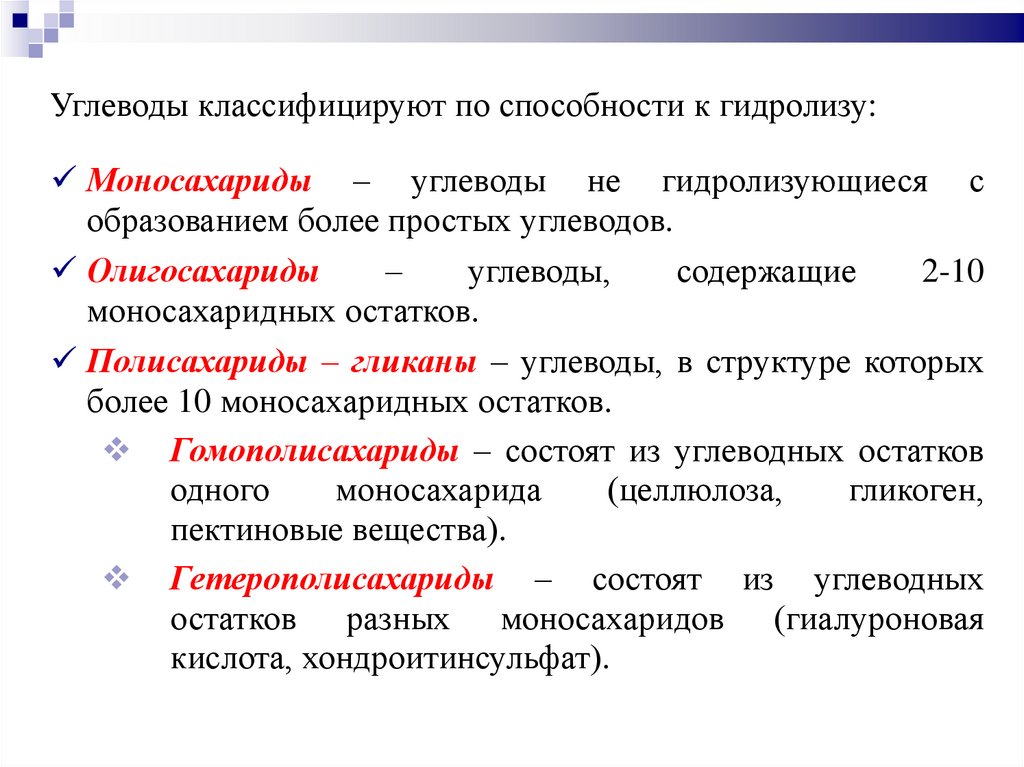 Углеводы классифицируют по способности к гидролизу:Моносахариды – углеводы не гидролизующиеся с
