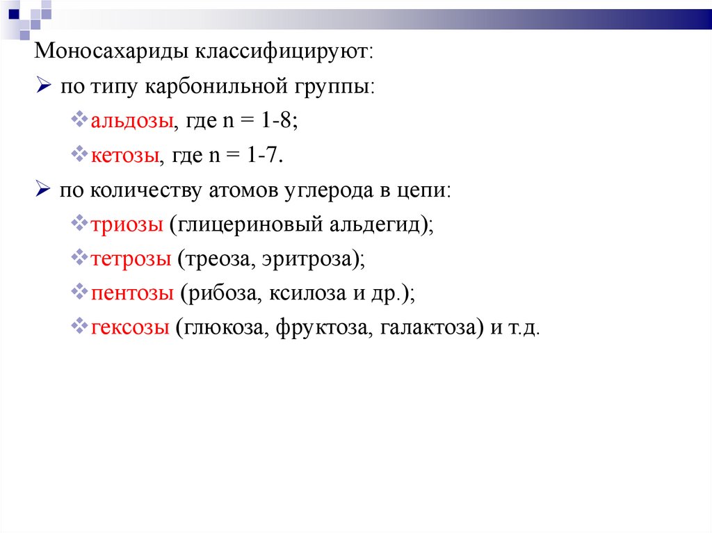Моносахариды классифицируют:по типу карбонильной группы: