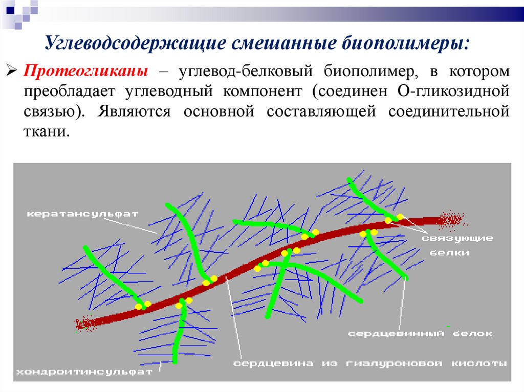 Углеводсодержащие смешанные биополимеры:Протеогликаны – углевод-белковый биополимер, в котором