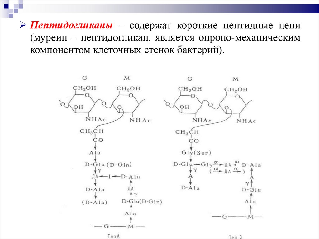 Пептидогликаны – содержат короткие пептидные цепи(муреин – пептидогликан, является опроно-механическим