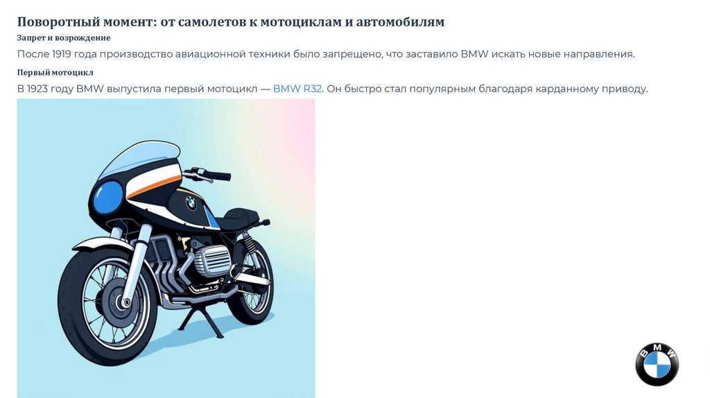 В 1923 году BMW выпустила первый мотоцикл — BMW R32. Он быстро стал популярным благодаря карданному приводу.