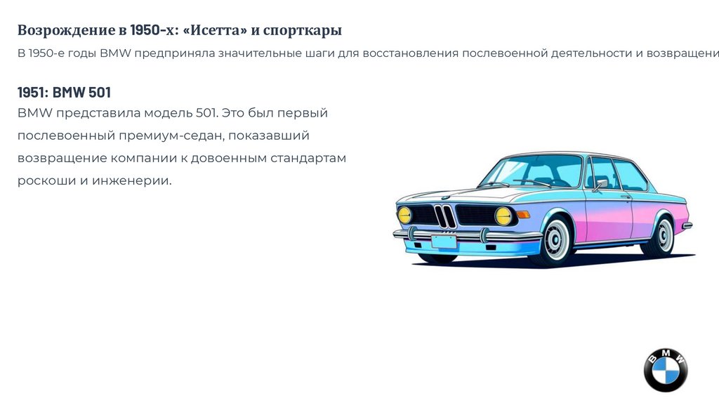 Возрождение в 1950-х: «Исетта» и спорткарыВ 1950-е годы BMW предприняла значительные шаги для восстановления послевоенной деятельности и возвращения