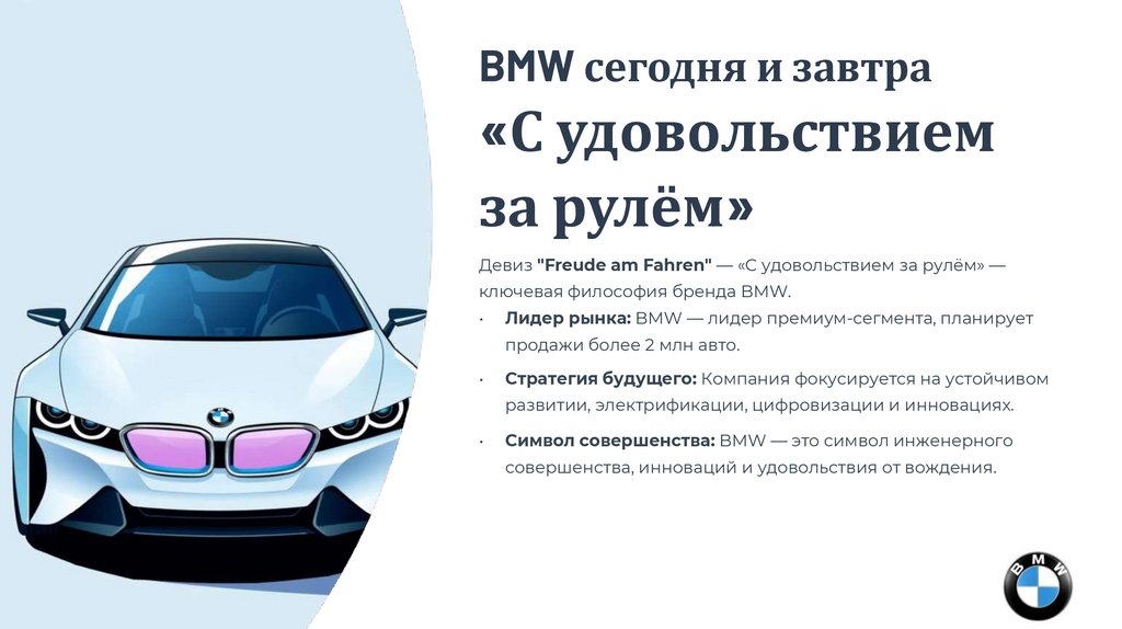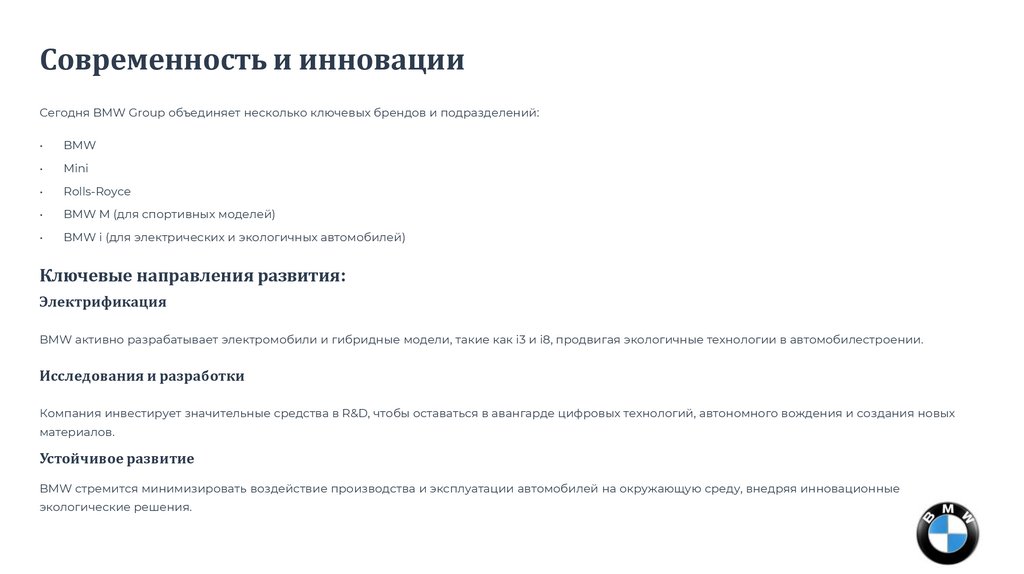 Современность и инновацииСегодня BMW Group объединяет несколько ключевых брендов и подразделений: