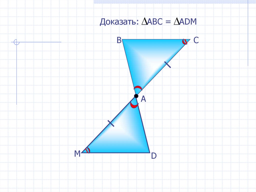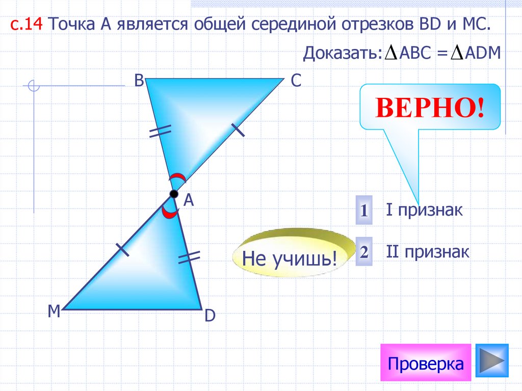 с.14 Точка А является общей серединой отрезков ВD и МС.Доказать: АВС = АDМ