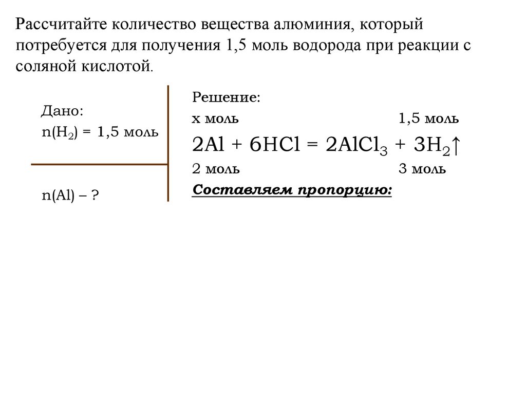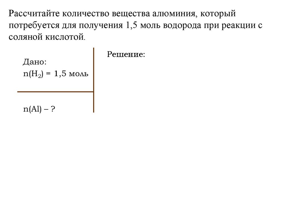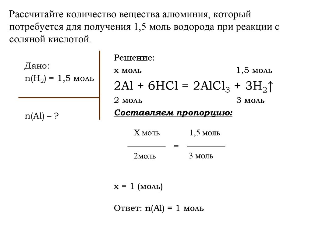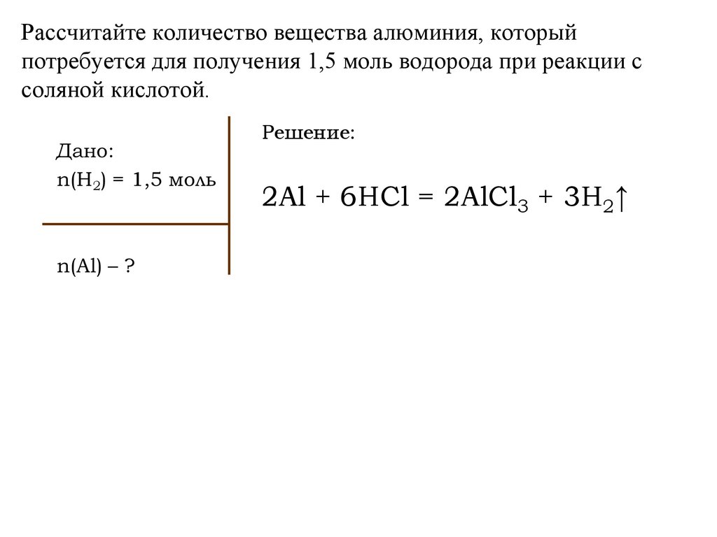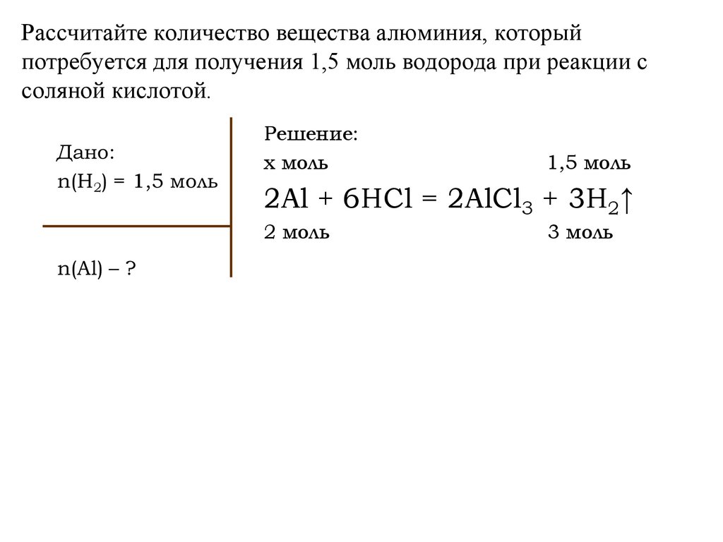 Рассчитайте количество вещества алюминия, которыйпотребуется для получения 1,5 моль водорода при реакции с
