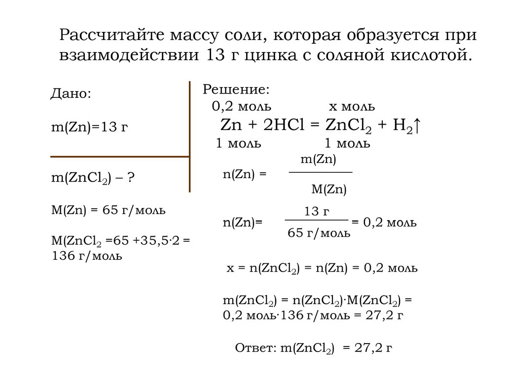 Рассчитайте массу соли, которая образуется привзаимодействии 13 г цинка с соляной кислотой.