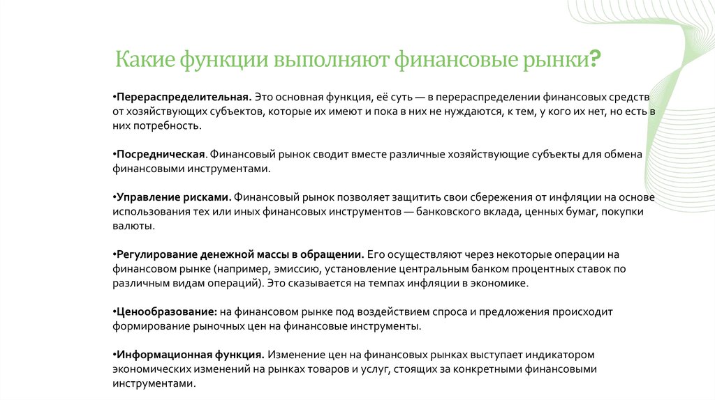 Какие функции выполняют финансовые рынки?•Перераспределительная. Это основная функция, её суть — в перераспределении финансовых средств