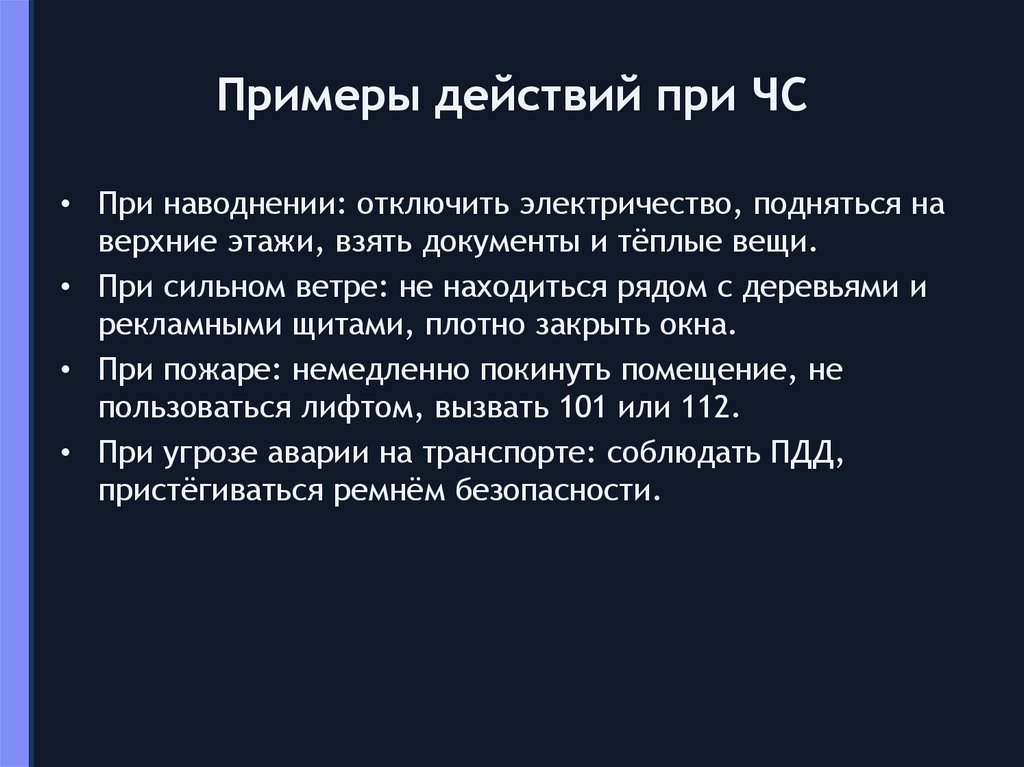Примеры действий при ЧС• При наводнении: отключить электричество, подняться на