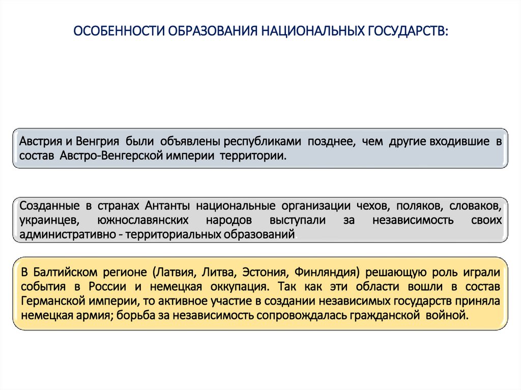 ОСОБЕННОСТИ ОБРАЗОВАНИЯ НАЦИОНАЛЬНЫХ ГОСУДАРСТВ:Австрия и Венгрия были объявлены республиками позднее, чем другие входившие в