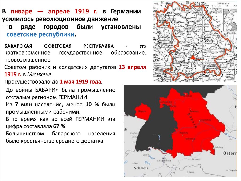 В период Ноябрьской революции в Баварии также была свергнута королевская власть.В феврале 1919 г. мюнхенский Совет рабочих, солдат и крестьян принимает решение