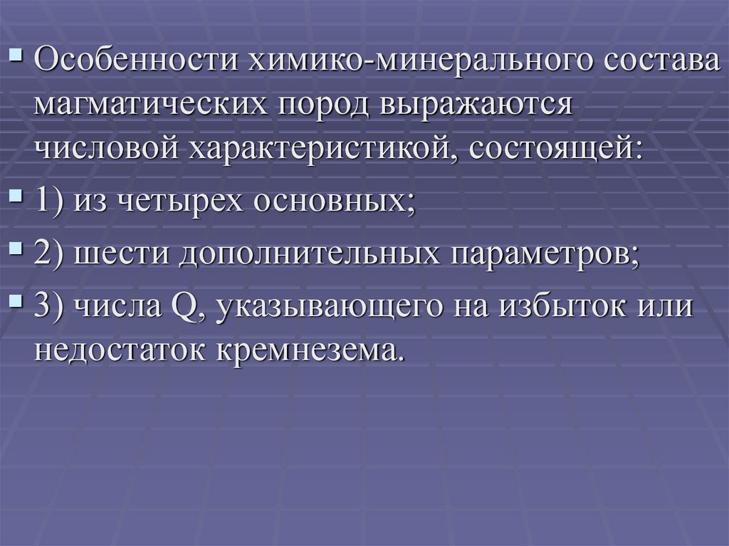 Особенности химико-минерального составамагматических пород выражаются