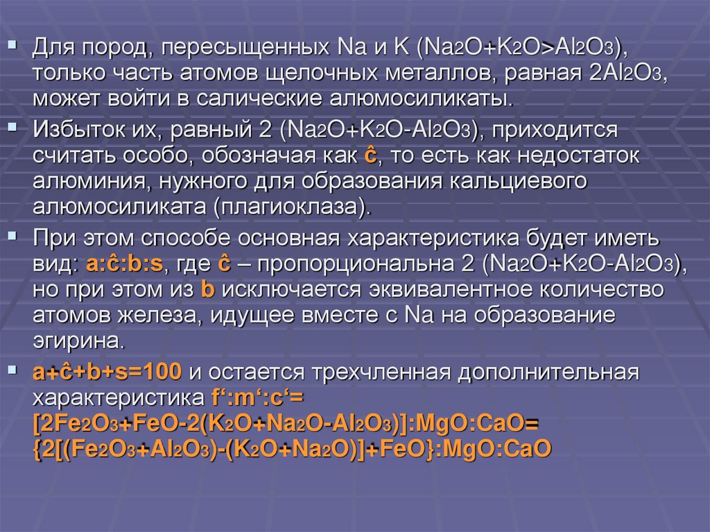 Для пород, пересыщенных Na и K (Na2O+K2O>Al2O3),только часть атомов щелочных металлов, равная 2Al2O3,
