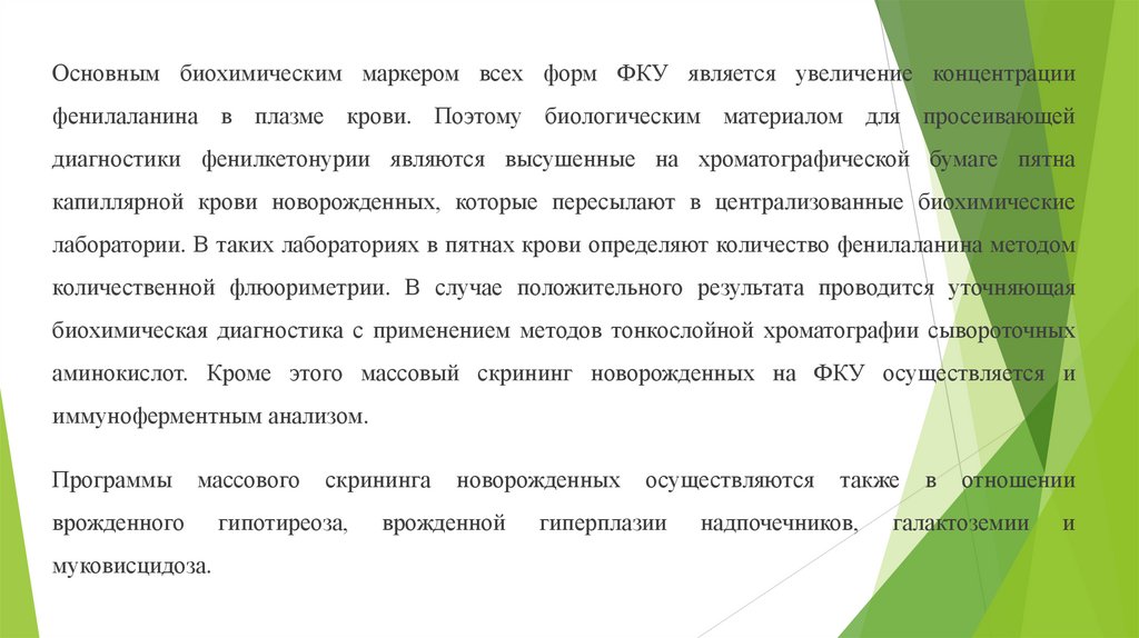 Основным биохимическим маркером всех форм ФКУ является увеличение концентрациифенилаланина в плазме крови. Поэтому биологическим материалом для просеивающей