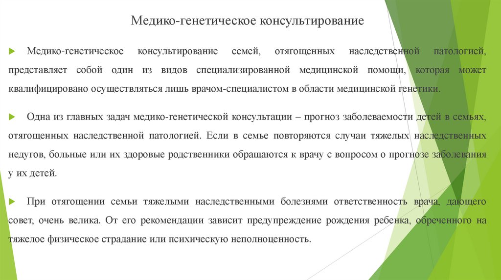 родителям в принятии решения по поводу планирования беременности и проведения пренатальной диагностики. При этом врачгенетик должен предоставить семье объективную информацию о возможных рисках на всех этапах подготовки и проведения