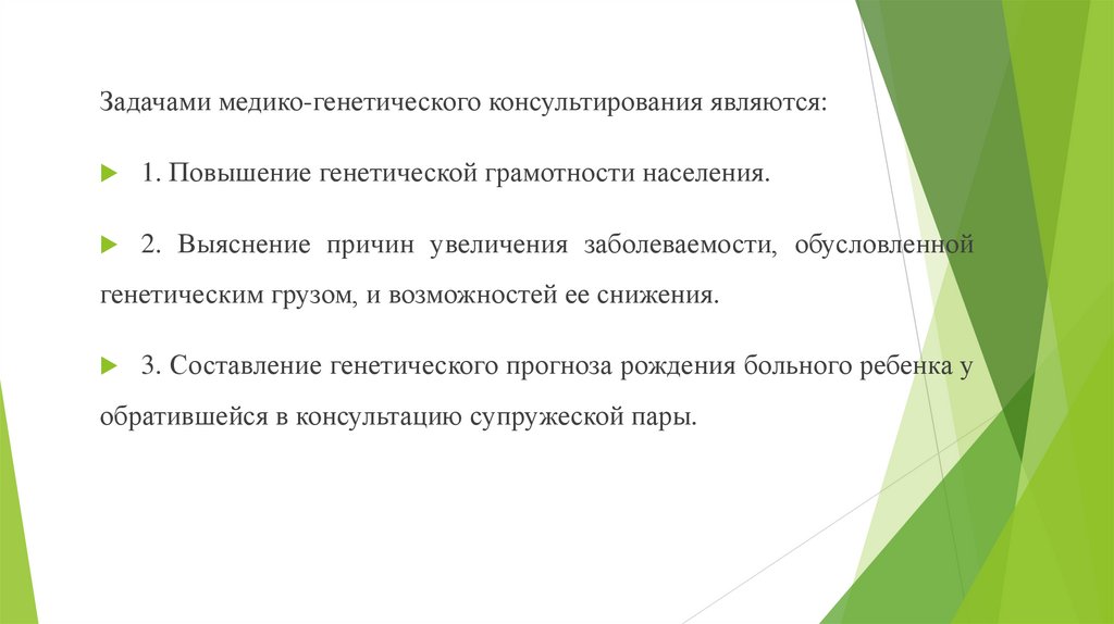 Задачами медико-генетического консультирования являются:1. Повышение генетической грамотности населения.