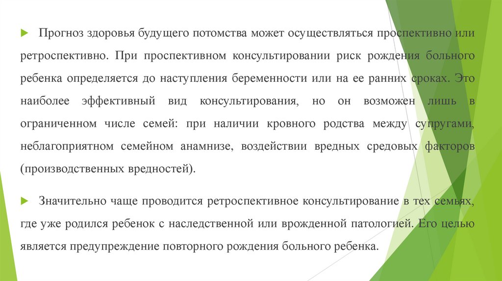Прогноз здоровья будущего потомства может осуществляться проспективно илиретроспективно. При проспективном консультировании риск рождения больного
