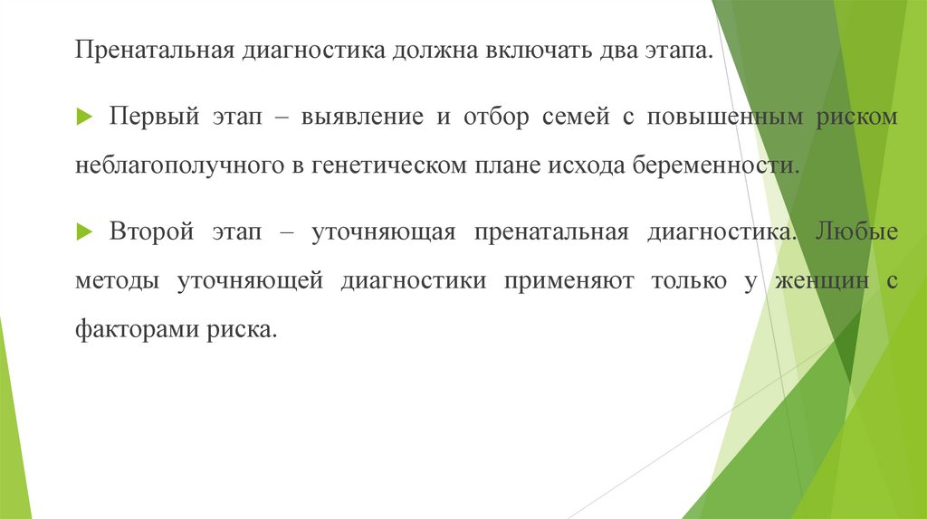 Пренатальная диагностика должна включать два этапа.Первый этап – выявление и отбор семей с повышенным риском