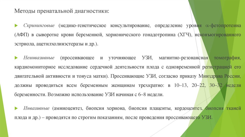 Методы пренатальной диагностики:Скрининговые (медико-генетическое консультирование, определение уровня -фетопротеина