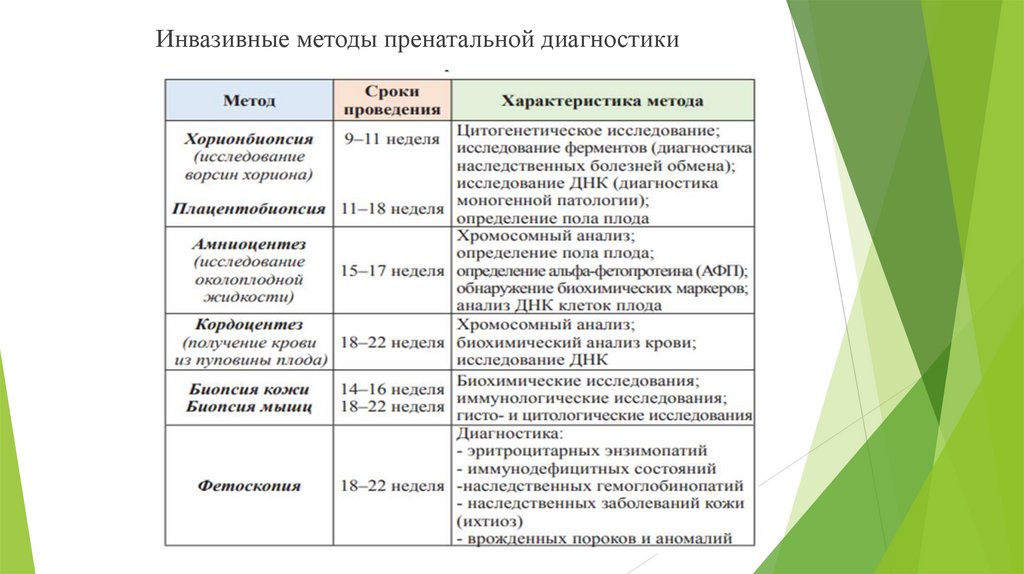 Инвазивные (амниоцентез, биопсия хориона, биопсия плаценты, кордоцентез, биопсия тканей