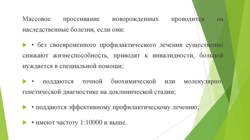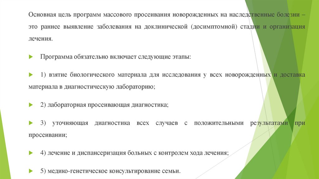 Основная цель программ массового просеивания новорожденных на наследственные болезни –это раннее выявление заболевания на доклинической (досимптомной) стадии и организация