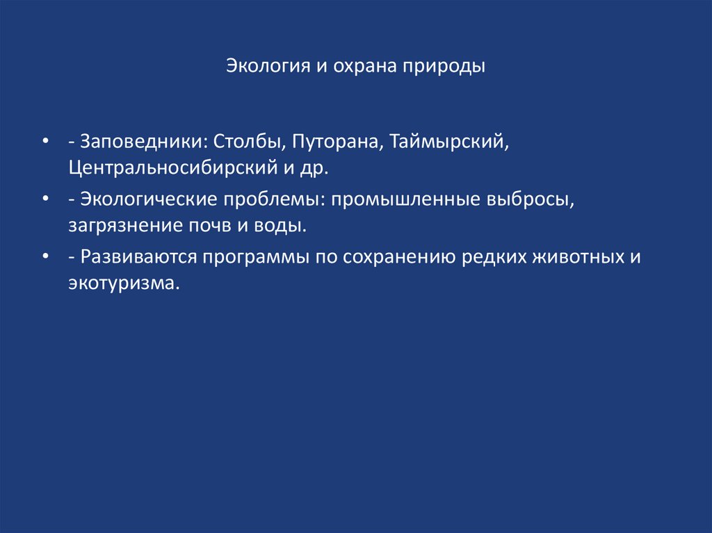 Экология и охрана природы• - Заповедники: Столбы, Путорана, Таймырский,