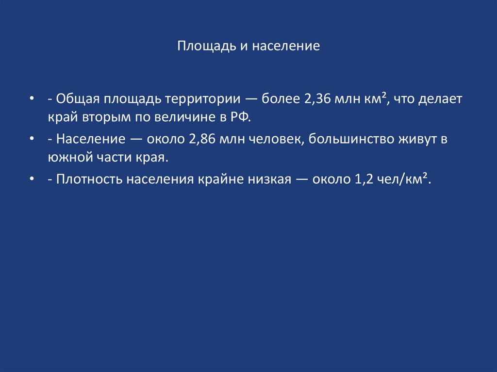 Площадь и население• - Общая площадь территории — более 2,36 млн км², что делает
