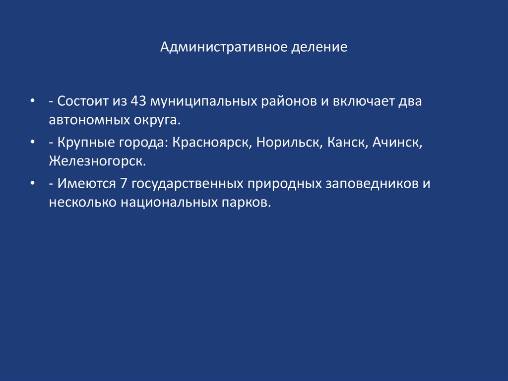 • - Крупные города: Красноярск, Норильск, Канск, Ачинск,