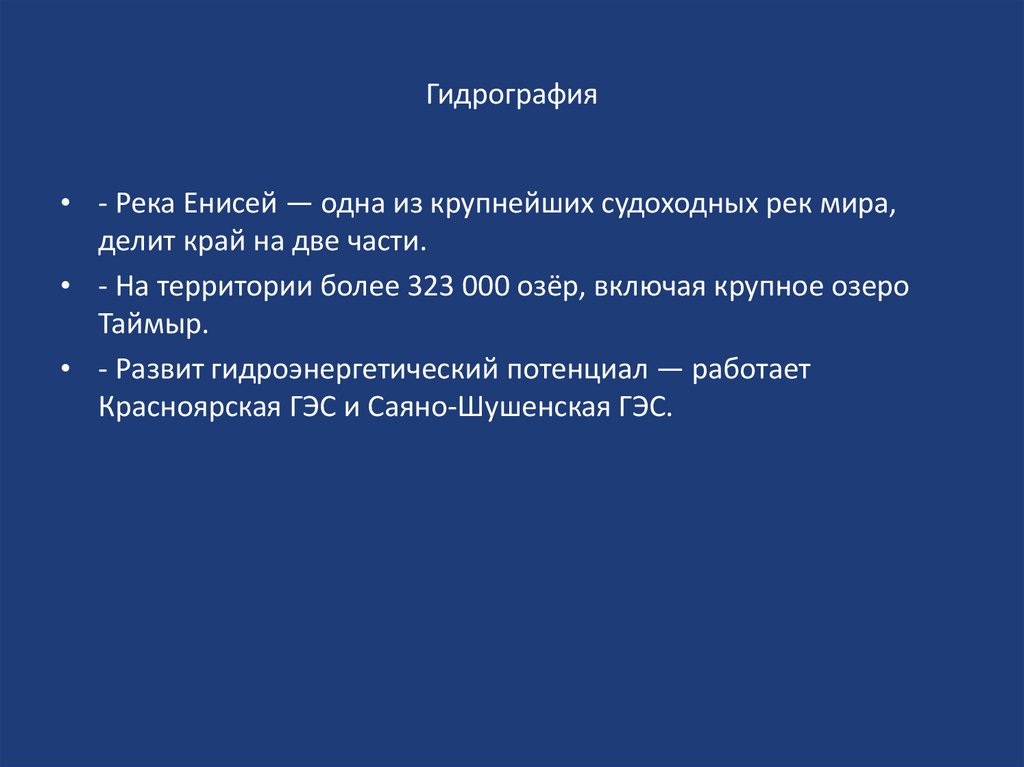 Гидрография• - Река Енисей — одна из крупнейших судоходных рек мира,
