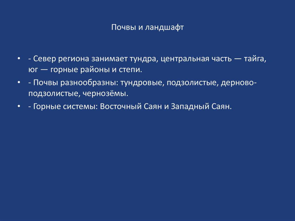 Почвы и ландшафт• - Север региона занимает тундра, центральная часть — тайга,