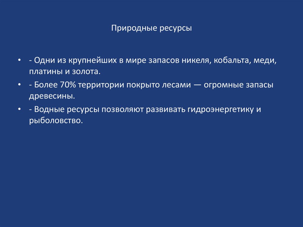 Природные ресурсы• - Одни из крупнейших в мире запасов никеля, кобальта, меди,