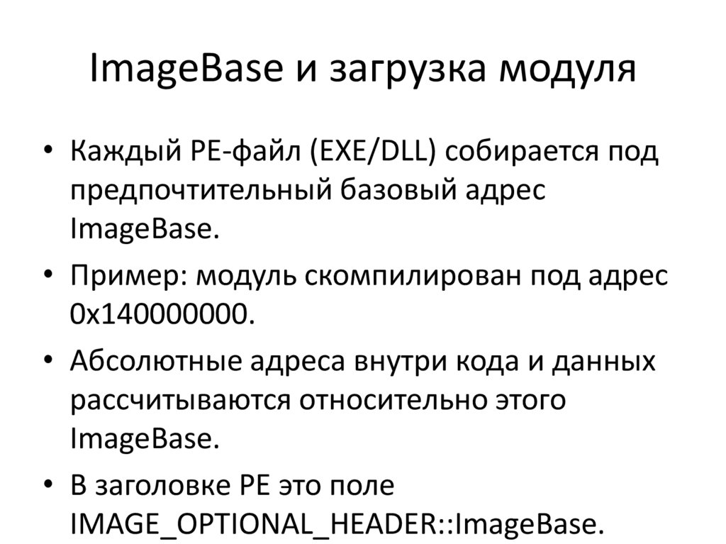 ImageBase и загрузка модуля• Каждый PE-файл (EXE/DLL) собирается под
