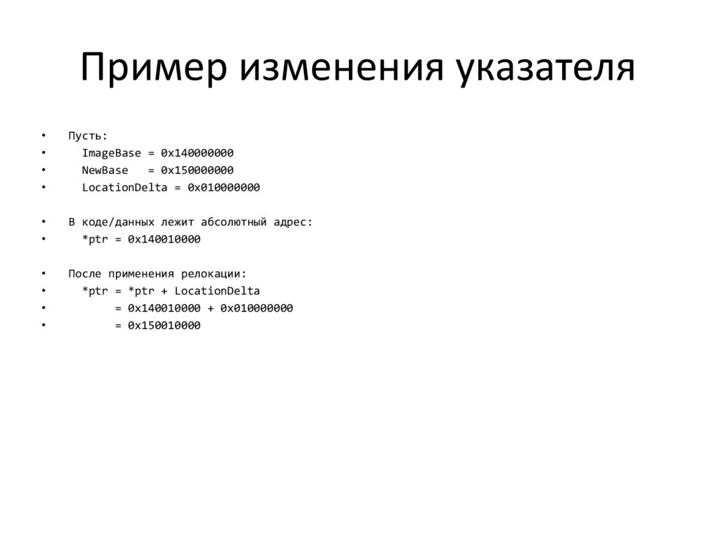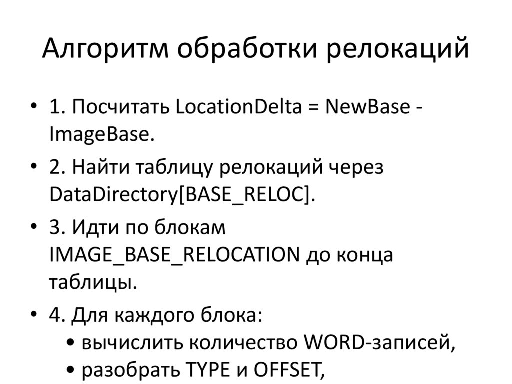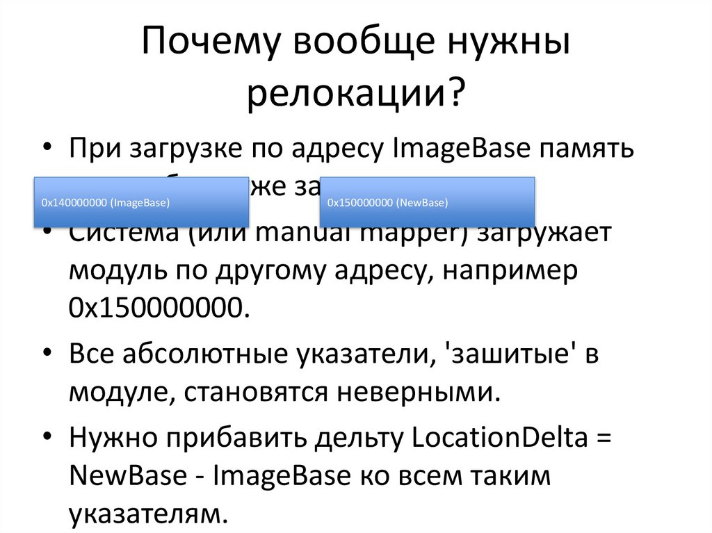 Алгоритм обработки релокаций• 1. Посчитать LocationDelta = NewBase ImageBase.