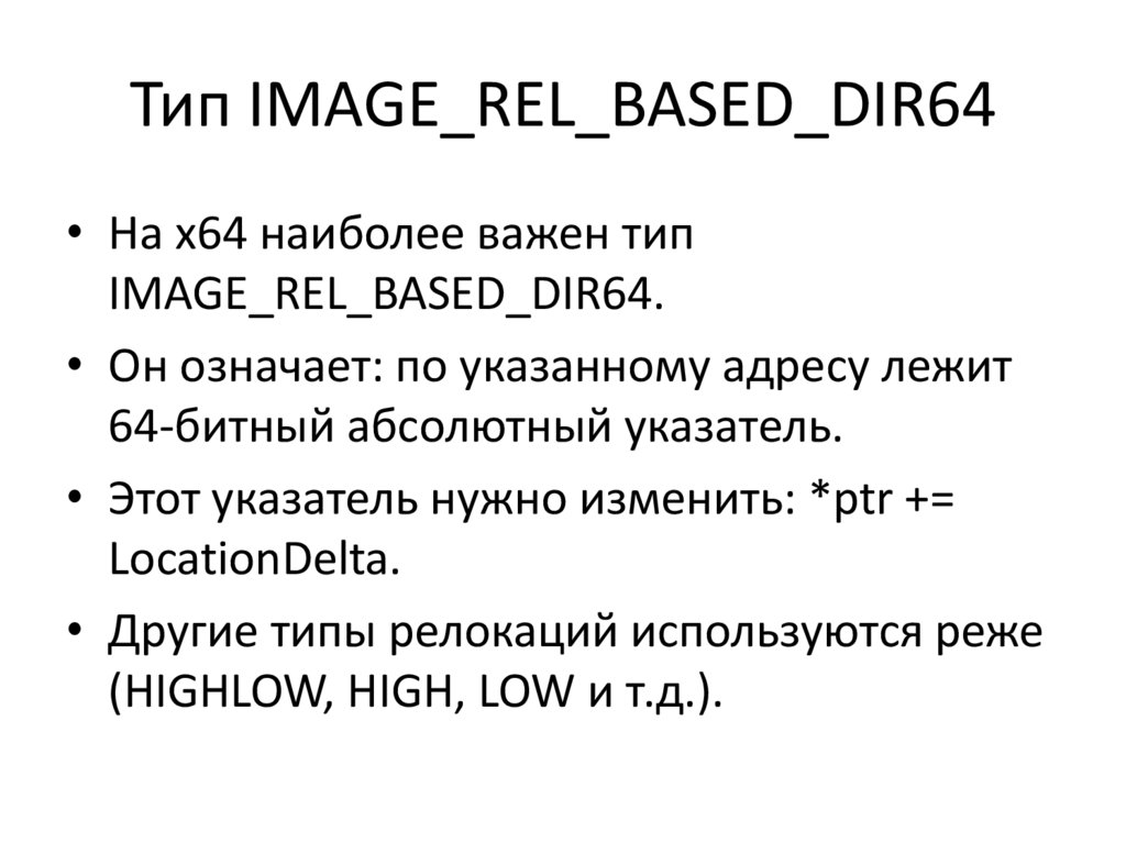 Тип IMAGE_REL_BASED_DIR64• На x64 наиболее важен тип