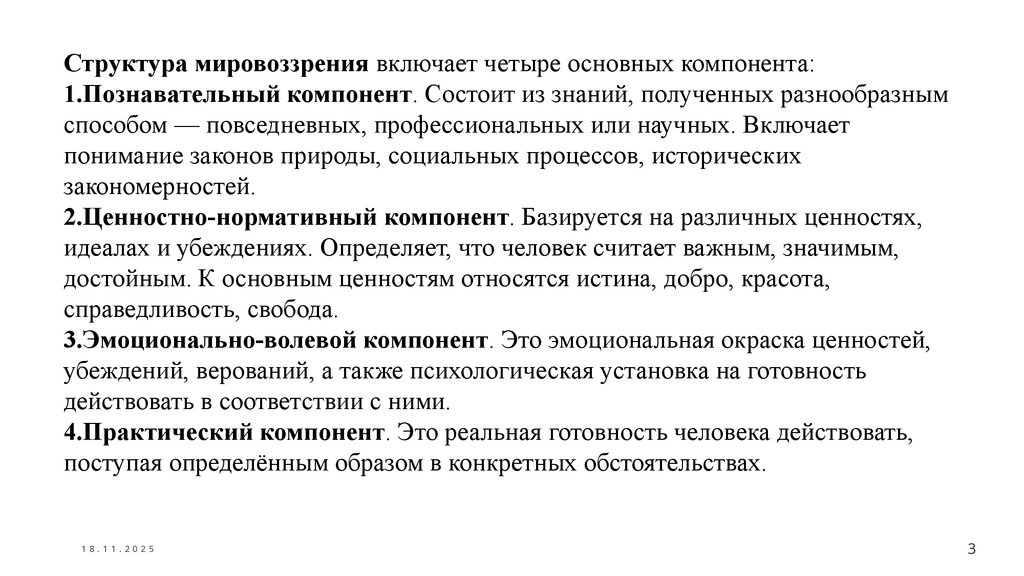 Структура мировоззрения включает четыре основных компонента:1.Познавательный компонент. Состоит из знаний, полученных разнообразным