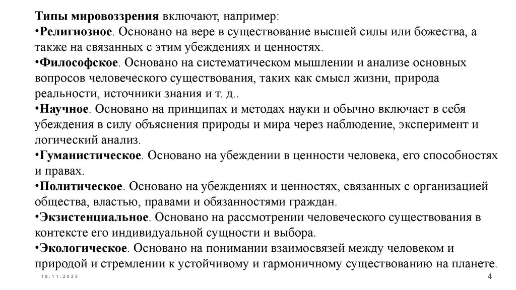 Типы мировоззрения включают, например:•Религиозное. Основано на вере в существование высшей силы или божества, а