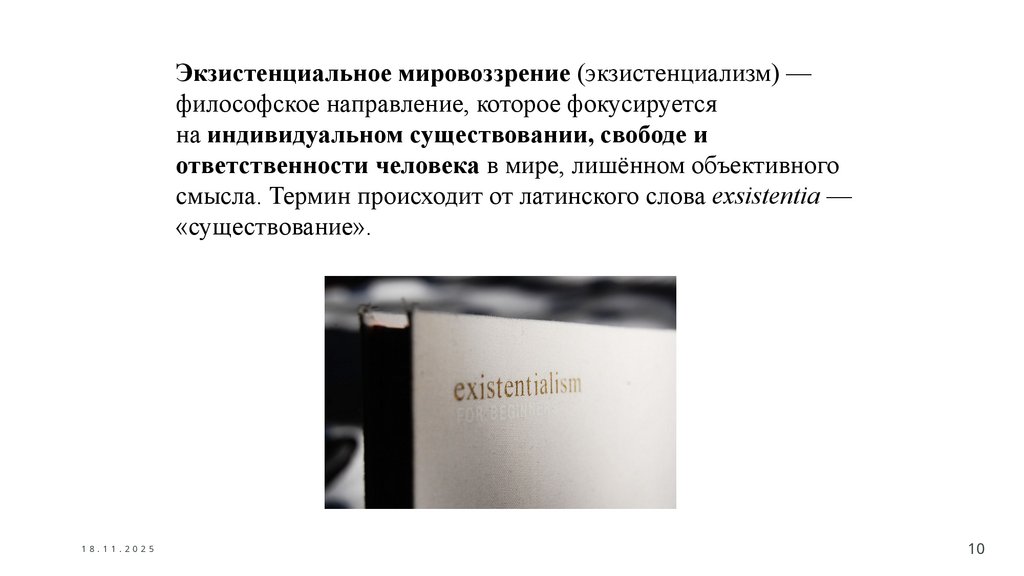 Экзистенциальное мировоззрение (экзистенциализм) —философское направление, которое фокусируется