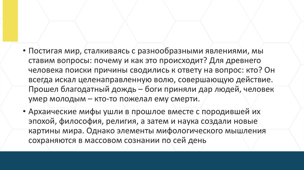 • Постигая мир, сталкиваясь с разнообразными явлениями, мыставим вопросы: почему и как это происходит? Для древнего