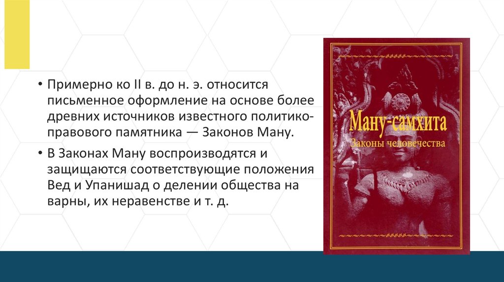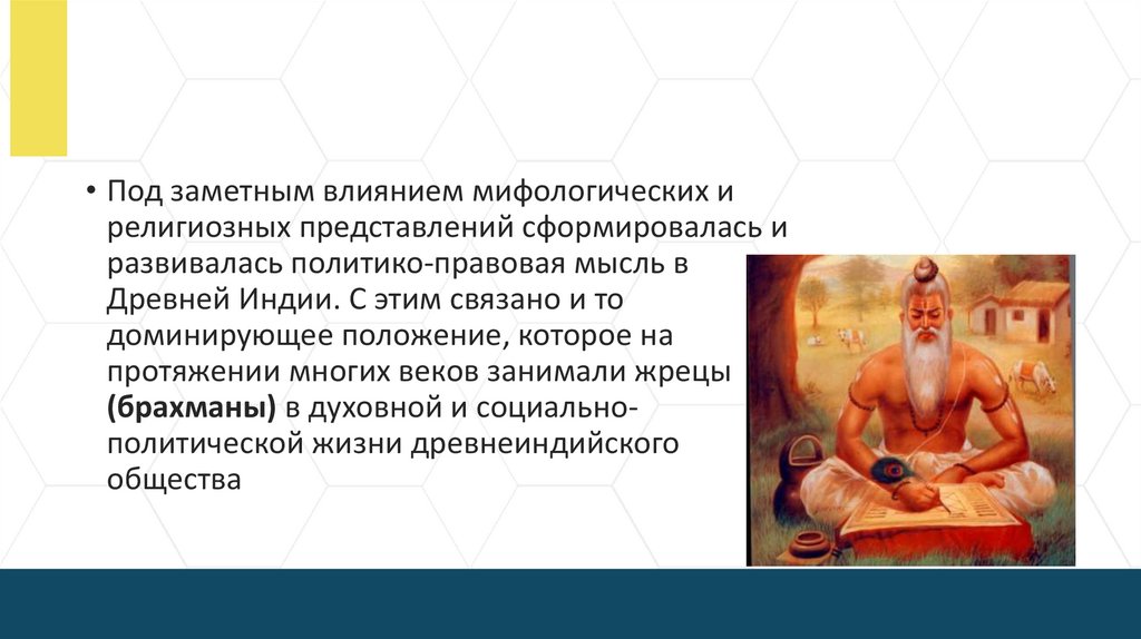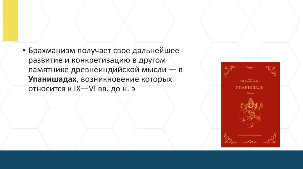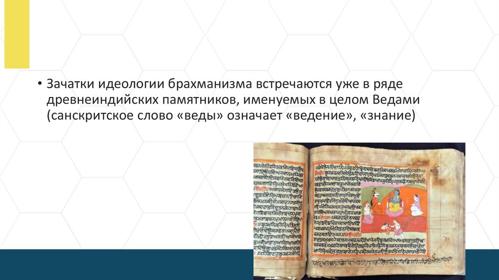 • Зачатки идеологии брахманизма встречаются уже в рядедревнеиндийских памятников, именуемых в целом Ведами