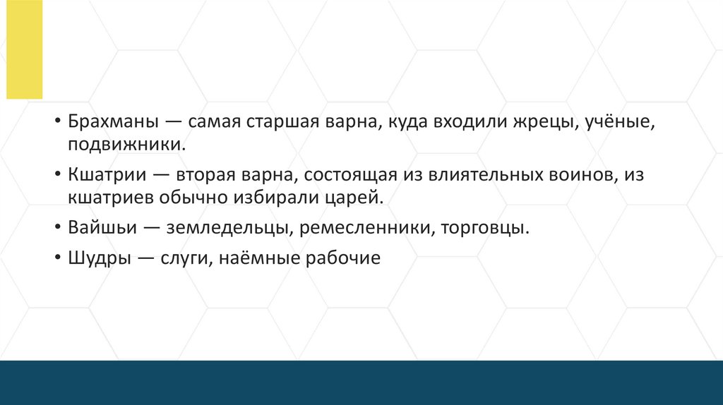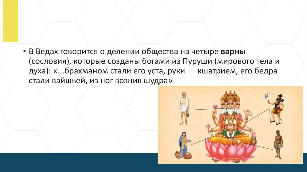 • В Ведах говорится о делении общества на четыре варны(сословия), которые созданы богами из Пуруши (мирового тела и