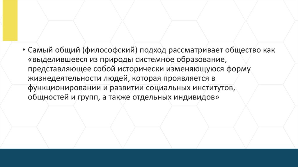 • Самый общий (философский) подход рассматривает общество как«выделившееся из природы системное образование,