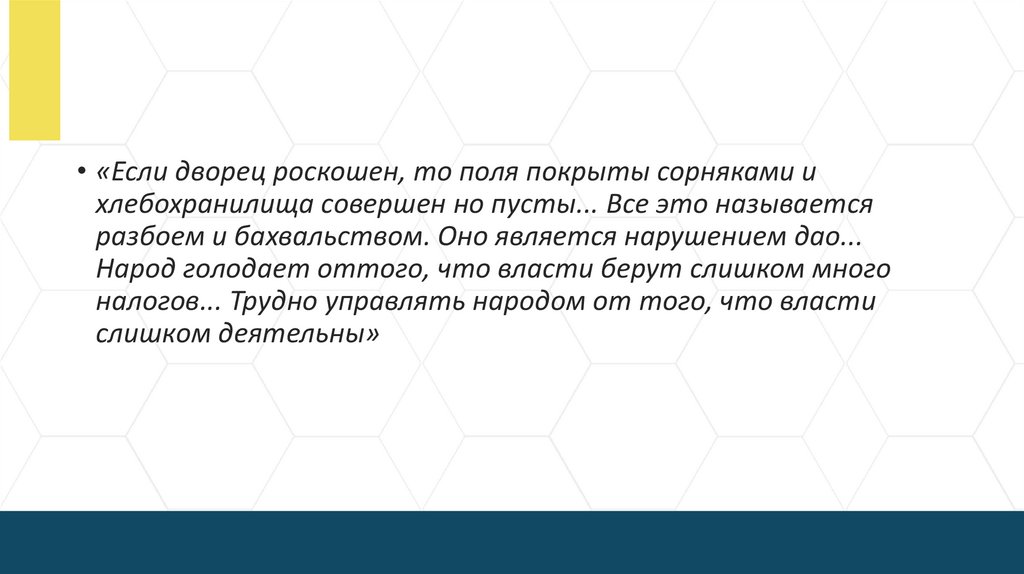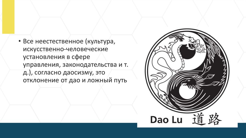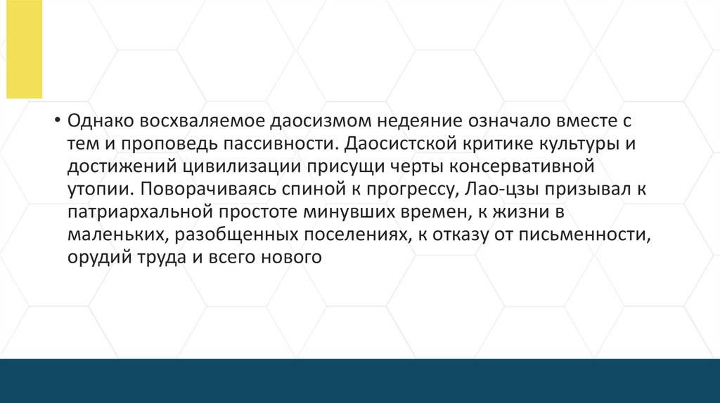 • Однако восхваляемое даосизмом недеяние означало вместе стем и проповедь пассивности. Даосистской критике культуры и