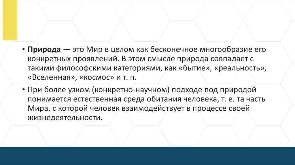 • Природа — это Мир в целом как бесконечное многообразие егоконкретных проявлений. В этом смысле природа совпадает с