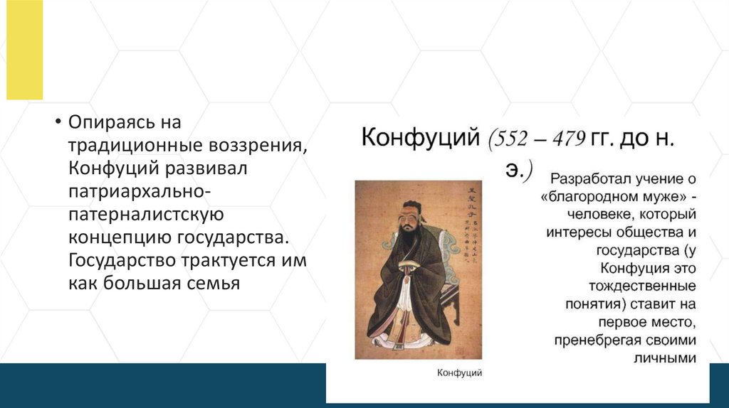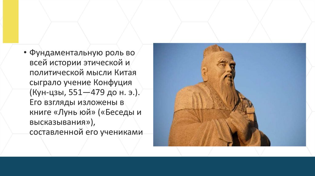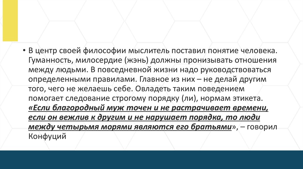 • В центр своей философии мыслитель поставил понятие человека.Гуманность, милосердие (жэнь) должны пронизывать отношения