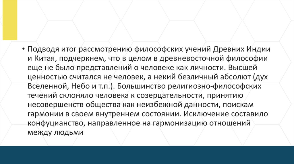 • Подводя итог рассмотрению философских учений Древних Индиии Китая, подчеркнем, что в целом в древневосточной философии