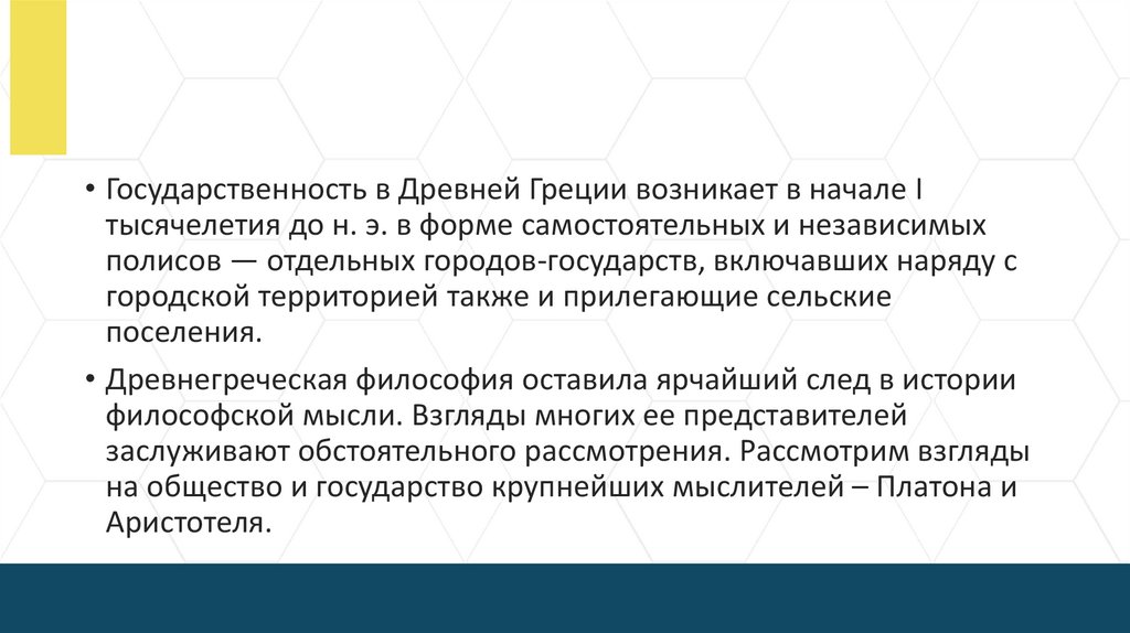 • Государственность в Древней Греции возникает в начале Iтысячелетия до н. э. в форме самостоятельных и независимых