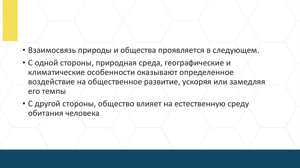 • Взаимосвязь природы и общества проявляется в следующем.• С одной стороны, природная среда, географические и
