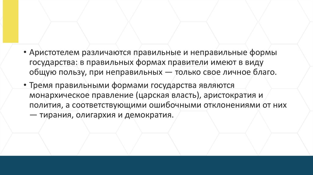 • Аристотелем различаются правильные и неправильные формыгосударства: в правильных формах правители имеют в виду