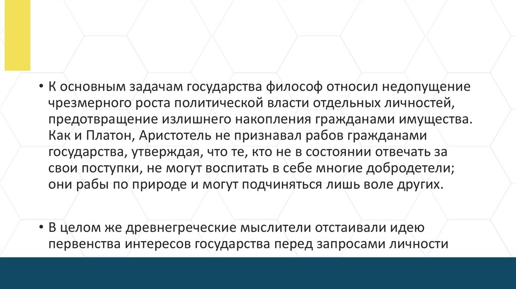 • К основным задачам государства философ относил недопущениечрезмерного роста политической власти отдельных личностей,