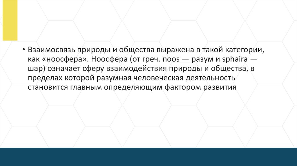 • Взаимосвязь природы и общества выражена в такой категории,как «ноосфера». Ноосфера (от греч. noos — разум и sphaira —