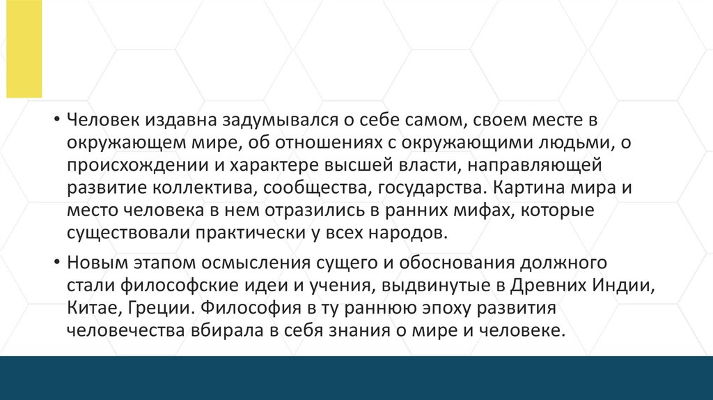 • Человек издавна задумывался о себе самом, своем месте вокружающем мире, об отношениях с окружающими людьми, о